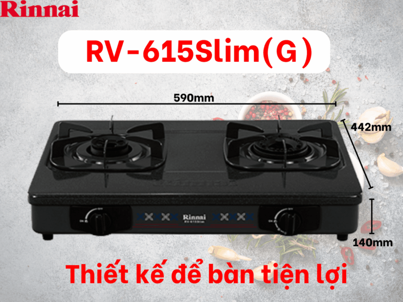 Dưới đây là đánh giá tổng quan về bếp ga để bàn Rinnai RV-615SLIM(G), một trong những model bếp ga dương được ưa chuộng của Rinnai tại thị trường Việt Nam hiện nay, nổi bật với sự kết hợp giữa thiết kế gọn gàng, bền bỉ và hiệu quả sử dụng vượt trội. Mã (G) trong tên sản phẩm thường ám chỉ màu sắc xám (Grey) hoặc loại mặt bếp được phủ men chống dính màu xám.