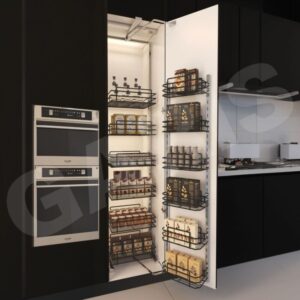 - Ứng dụng: Lắp đặt trong tủ bếp đứng (tủ cao), giúp tối ưu hóa không gian lưu trữ chiều cao. Sản phẩm được gắn trực tiếp vào cánh tủ và kéo ra toàn bộ khi mở cửa.