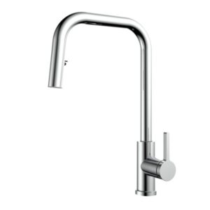 - Kiểu dáng: Vòi dây rút thế hệ mới, đầu vòi cong chữ U, tay điều khiển thiết kế công thái học, nút bấm ẩn